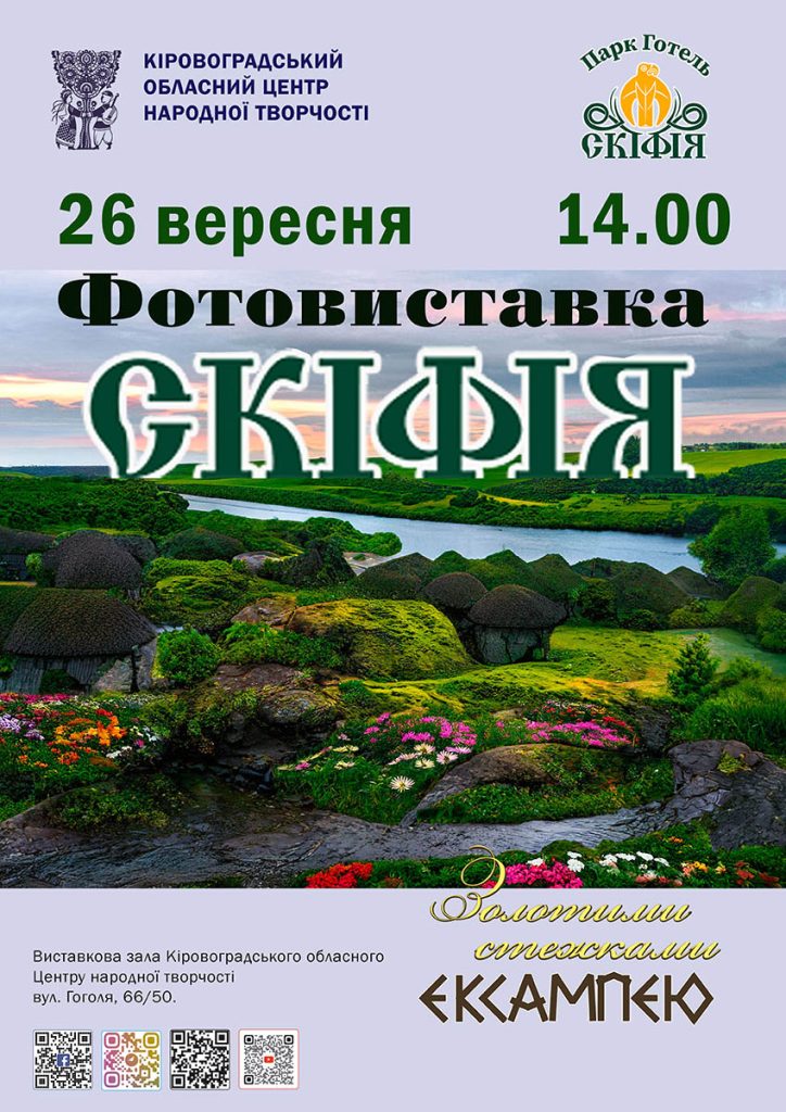 Кіровоградський обласний Центр народної творчості запрошує 26 вересня 2025 року о 14.00 на відкриття фотовиставки «Золотими стежками Ексампею», яка є результатом фотопленеру, що відбувся у червні цього року на території Парку-готелю «Скіфія».